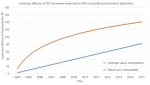 Podle tohohle grafu to vypadá, že špičkové warm-white LED na trhu by se tam (180 lm/W) mohly dotáhnout za 10 let, a běžný standard na trhu tak za 20 let.